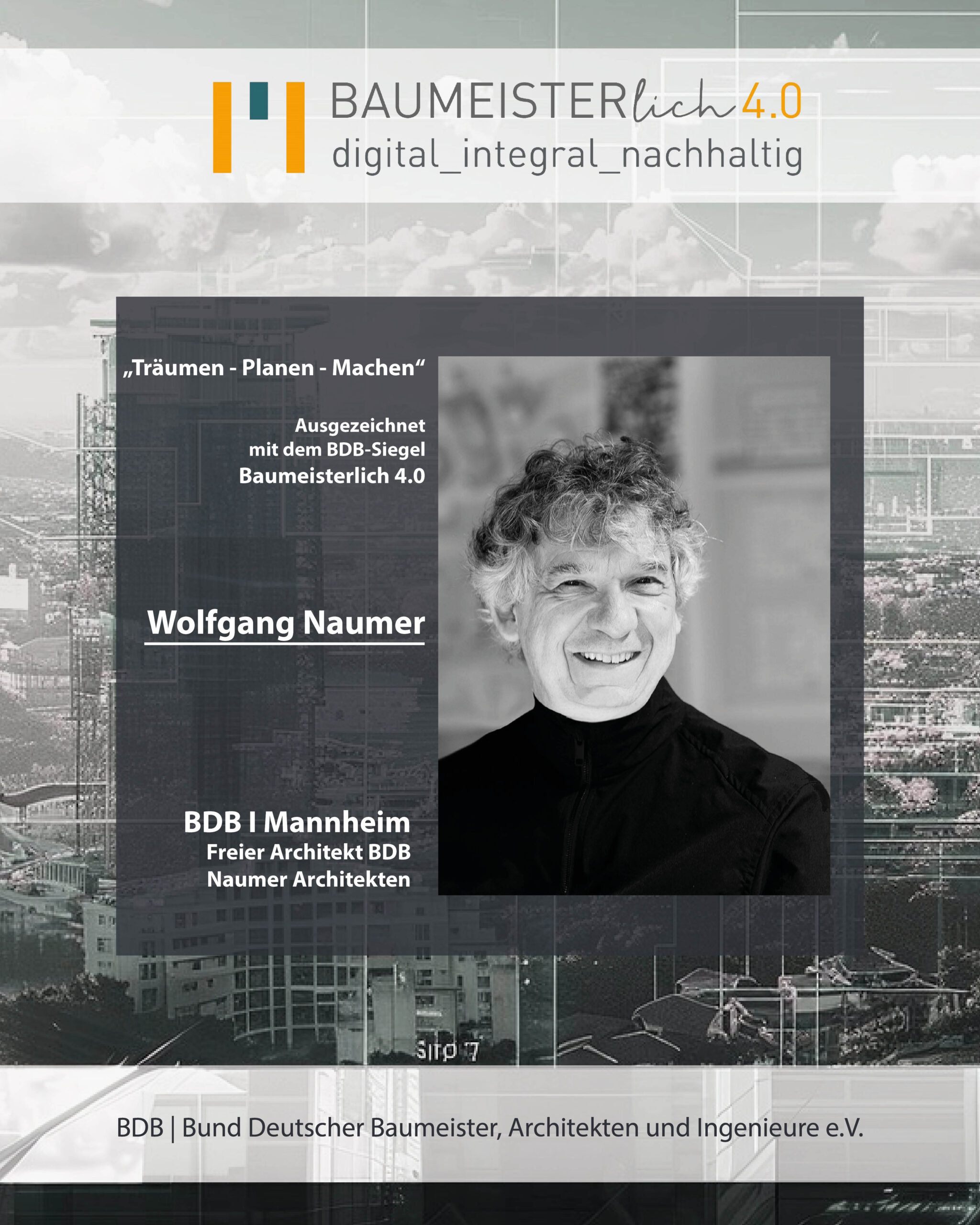 Wir sind das Netzwerk für Architekt:innen, Bauingenieur:innen und Stadtplaner:innen - egal ob freischaffend oder angestellt. Auch Baupraktiker:innen und Studierende der planenden Berufe sind elementare Bestandteile des BDB.